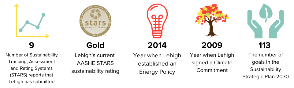 The Sustainability Tracking, Assessment & Rating SystemTM (STARS) is a self-reporting tracking and rating system for sustainability performance at colleges and universities. Colleges and universities reporting to STARS can earn credits and points to achieve bronze, silver, gold, or platinum rating by demonstrating efforts in sustainability in four major categories: Academics, Engagement, Operations, and Planning & Administration. Lehigh submitted its seventh report to STARS in February 2021, and received a gold rating for the first time.