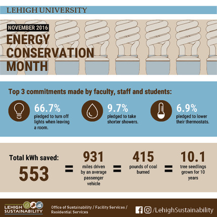 During the month of November, we challenge members of the Lehigh community to be conscious of their energy consumption behaviors, to commit to adopting new energy saving behaviors, and to engage with peers and coworkers on the topic of energy conservation. Energy Conservation Month is designed to reduce university-wide energy consumption leading into the cold, dark winter months when lighting and heating are heavily used. A competition with Lafayette College will help to inspire the Lehigh campus community to greater levels of conservation. Learn more.