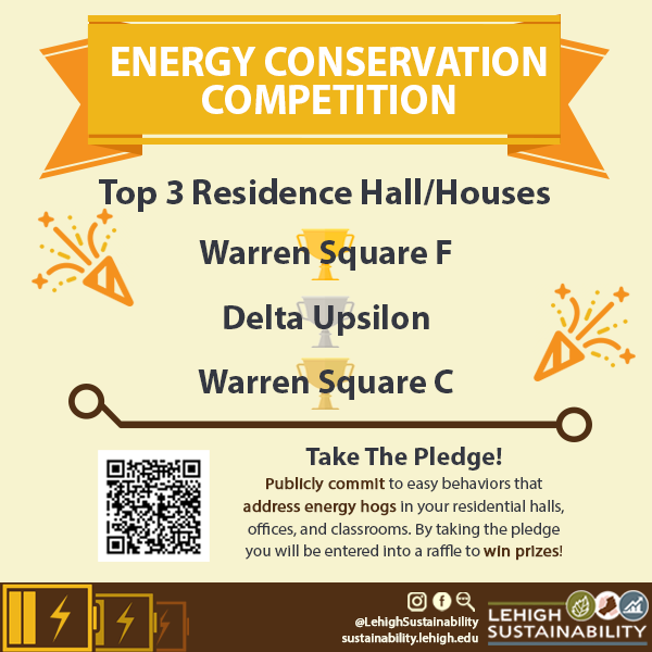 In November, Lehigh’s Office of Sustainability celebrated Energy Conservation Month. Throughout the month, we challenged members of the Lehigh community to be conscious of their energy consumption, to commit to adopting new energy-saving behaviors, and to engage with peers and coworkers on the topic of energy conservation. This challenge is designed to reduce university-wide energy consumption leading into the winter months when heating and lighting are heavily used.