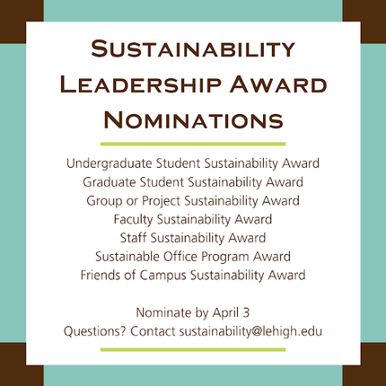 The inaugural Lehigh Sustainability Leadership Awards nomination period has begun and will continue through Friday, April 3 at 5:00pm. The purpose of the Lehigh Sustainability Awards is to recognize the contributions of the Lehigh community members and friends of Lehigh in advancing sustainability initiatives on campus. You are encouraged to take this opportunity to nominate faculty, staff, students, and friends of Lehigh for being a sustainability champion and for making a large impact in the last year at Lehigh. Nominations are currently being accepted for the following prestigious awards: