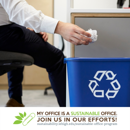 Lehigh’s Sustainable Office Program is a voluntary, self-guided program designed for faculty and staff to take the lead on promoting sustainable practices in the workplace. Through the program, faculty and staff can identify opportunities for innovation and can implement sustainable changes. They can reduce their environmental footprint, be responsible stewards of university’s resources, contribute to Lehigh’s sustainability goals and commitments, and build a campus community for the 21st Century. Learn more.